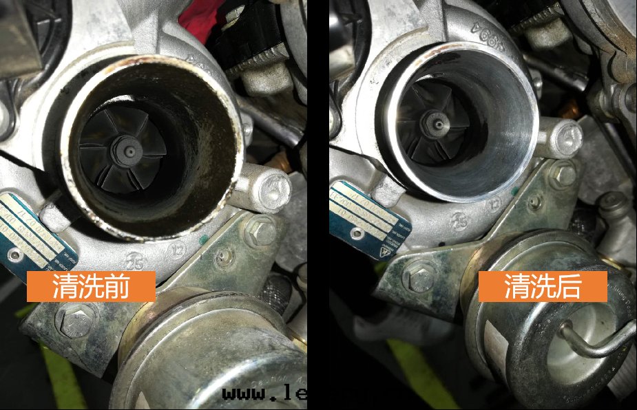 清(qīng)洗前(qián)涡輪被(bèi)油(yóu)泥(ní)附着黑(hēi)乎乎的(de),清(qīng)洗後(hòu)裸露(lù)出(chū)金(jīn)屬原色(sè)。