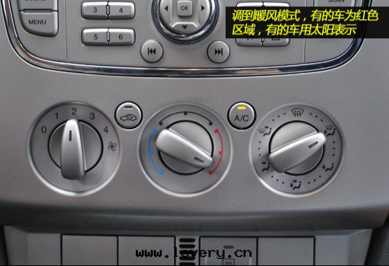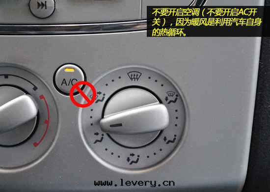 4. 不要(yào)開(kāi)啟空(kōng)調(不要(yào)開(kāi)啟AC開(kāi)關(guān)),因(yīn)为(wèi)暖風(fēng)是(shì)利用(yòng)汽車自(zì)身(shēn)的(de)热(rè)循环(huán),节(jié)省能源!