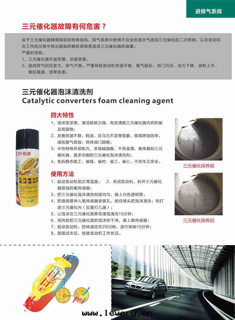 三(sān)元(yuán)催化器泡沫清(qīng)洗劑 (三(sān)元(yuán)催化清(qīng)洗劑)采用(yòng)高(gāo)新(xīn)技術(shù)使得泡沫型濃厚,清(qīng)潔除碳力強(qiáng),有(yǒu)效清(qīng)除三(sān)元(yuán)催化器內(nèi)的(de)積碳及(jí)殘留物(wù)。本(běn)産品由(yóu)美(měi)國(guó)ubrizol-UD、美(měi)國(guó)陶氏公(gōng)司提(tí)供原料原料及(jí)技術(shù)支持(chí),紮根(gēn)中(zhōng)國(guó)汽車養護用(yòng)品研发一(yī)级學(xué)府--華南(nán)理工大(dà)學(xué)化工系(xì),精心(xīn)研发而(ér)成(chéng)!