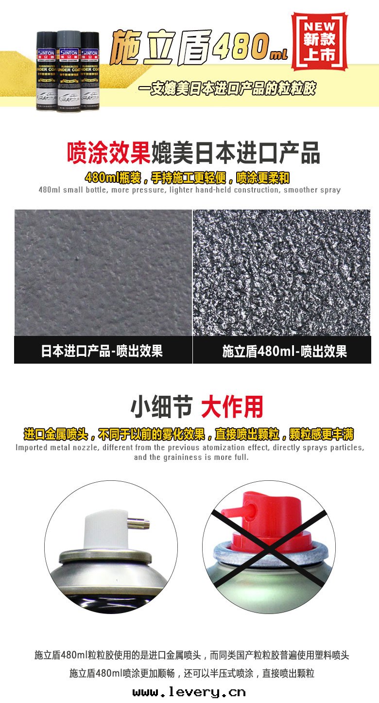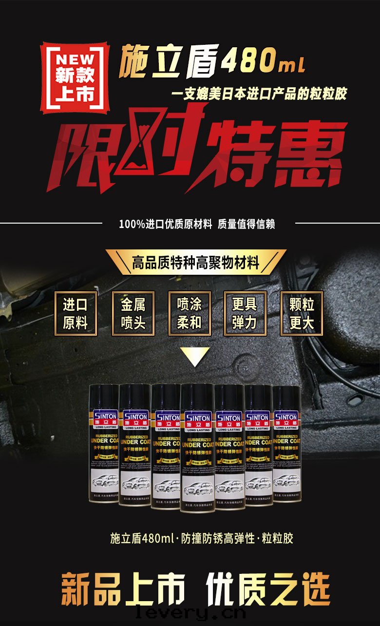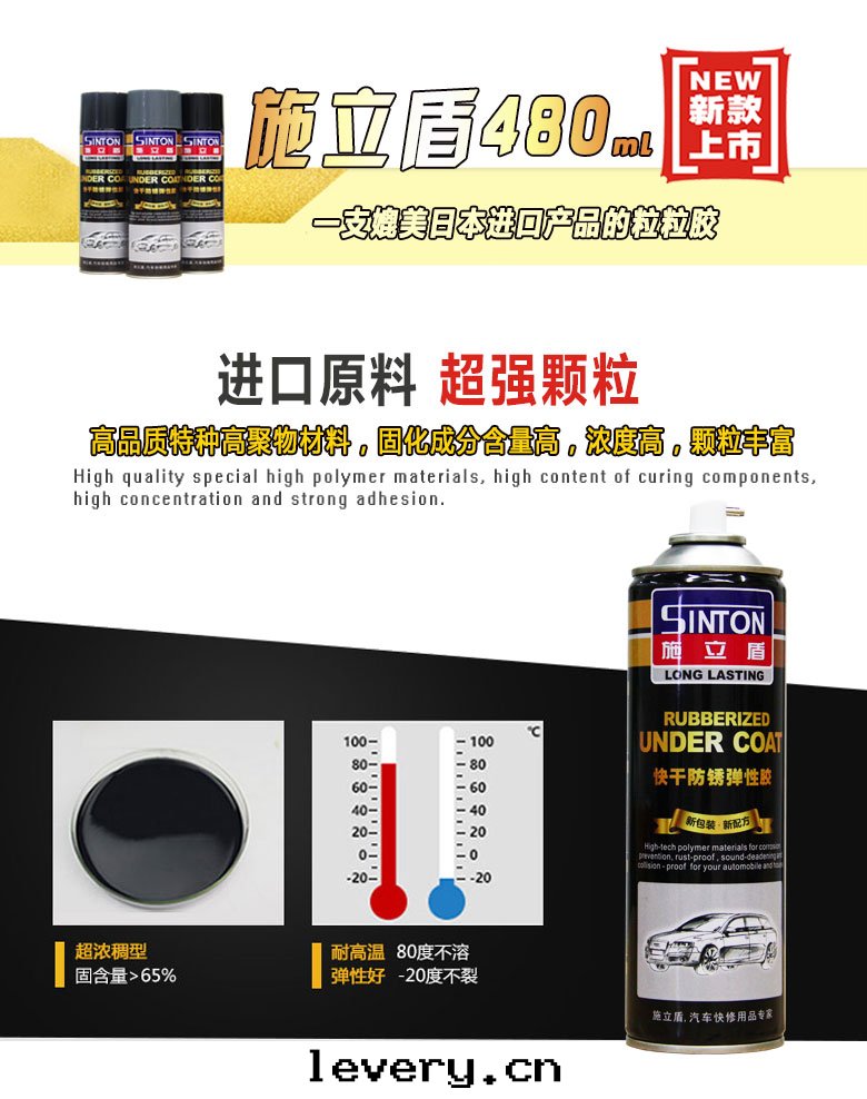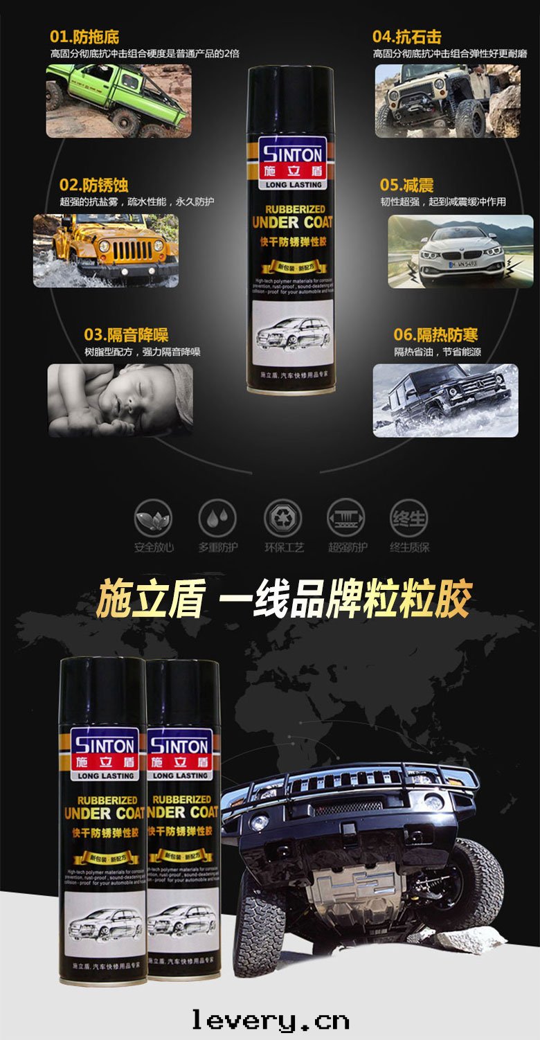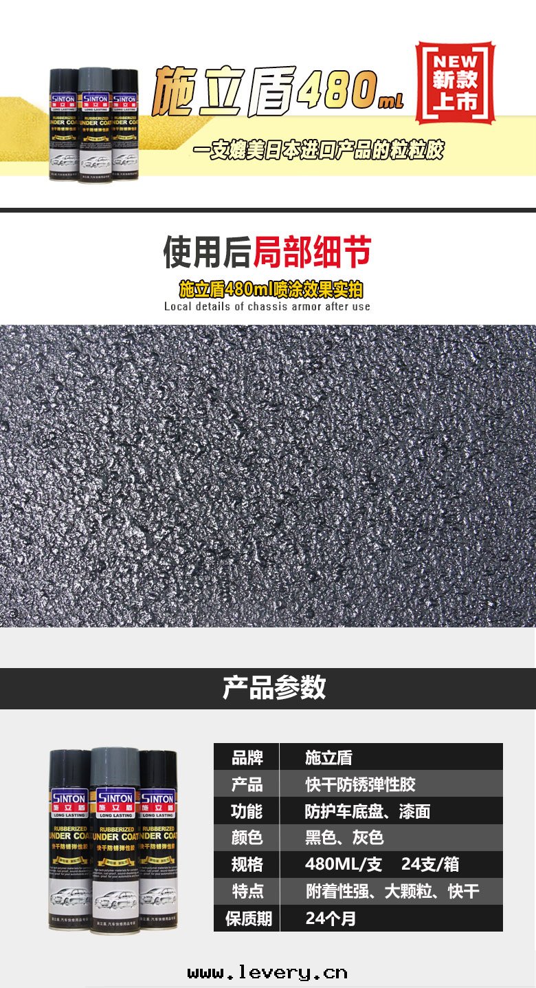 施立盾480粒粒胶(jiāo),本(běn)産品采用(yòng)特(tè)種(zhǒng)高(gāo)聚物(wù)材料進(jìn)口(kǒu)原材料,为(wèi)快(kuài)干(gàn)型手(shǒu)噴彈性(xìng)塗层(céng),具有(yǒu)防鏽、防水(shuǐ)、隔音(yīn)、堵漏有(yǒu)防撞擊等功能。固化後(hòu),可(kě)以(yǐ)在(zài)上(shàng)面(miàn)覆塗油(yóu)漆,是(shì)一(yī)種(zhǒng)多(duō)用(yòng)途的(de)車輛護理(lǐ)用(yòng)品。