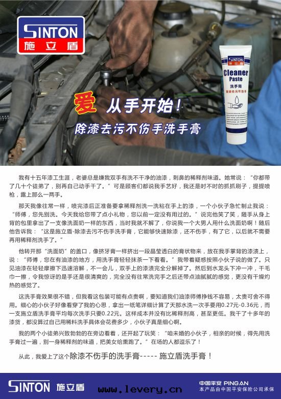 那(nà)天我(wǒ)像往常一(yī)樣(yàng),噴完漆後(hòu)正(zhèng)準備要拿稀釋劑洗一(yī)洗粘在(zài)手上(shàng)的(de)漆,一(yī)个(gè)小夥子急忙制止我(wǒ)说(shuō):“师(shī)傅,您先(xiān)别洗。今天我(wǒ)給(gěi)您带(dài)了(le)點(diǎn)小禮物(wù),您以(yǐ)前(qián)一(yī)定(dìng)没有(yǒu)用(yòng)过(guò)的(de)。”说(shuō)完他(tā)笑了(le)笑,随手從身(shēn)上(shàng)背的(de)包(bāo)里(lǐ)拿出(chū)了(le)一(yī)支像洗面(miàn)奶一(yī)樣(yàng)的(de)東(dōng)西(xī),當时(shí)我(wǒ)就(jiù)不(bù)解(jiě)了(le),你说(shuō)我(wǒ)一(yī)个(gè)大(dà)男人(rén)用(yòng)什(shén)麼(me)洗面(miàn)奶啊!随後(hòu)他(tā)告訴我(wǒ):“这(zhè)是(shì)施立盾-除漆去(qù)污不(bù)傷手洗手膏,它(tā)能(néng)夠快(kuài)速除漆,還(huán)不(bù)傷手,有(yǒu)了(le)它(tā),以(yǐ)後(hòu)就(jiù)不(bù)需要再用(yòng)稀釋劑洗手了(le)。”