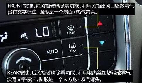 扇(shàn)形的(de)这(zhè)个(gè)标(biāo)志加上(shàng)向(xiàng)上(shàng)的(de)彎曲(qū)箭头(tóu),還(huán)有(yǒu)front字(zì)樣(yàng),打(dǎ)開(kāi)就(jiù)是(shì)前(qián)風(fēng)擋除霧(wù)功能,有(yǒu)rear的(de),就(jiù)是(shì)後(hòu)風(fēng)擋除霧(wù)功能。