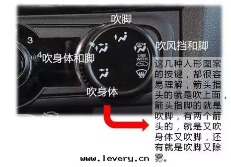 这(zhè)幾(jǐ)个(gè)按鈕很容易理(lǐ)解(jiě),箭头(tóu)指向(xiàng)头(tóu)部(bù),就(jiù)是(shì)吹上(shàng)面(miàn);指向(xiàng)腳(jiǎo),就(jiù)是(shì)吹下面(miàn)。有(yǒu)两(liǎng)个(gè)箭头(tóu),就(jiù)是(shì)两(liǎng)个(gè)方(fāng)向(xiàng)出(chū)風(fēng)。還(huán)有(yǒu)就(jiù)是(shì)吹腳(jiǎo)和(hé)除霧(wù)的(de),新手(shǒu)容易忘掉除霧(wù)功能。