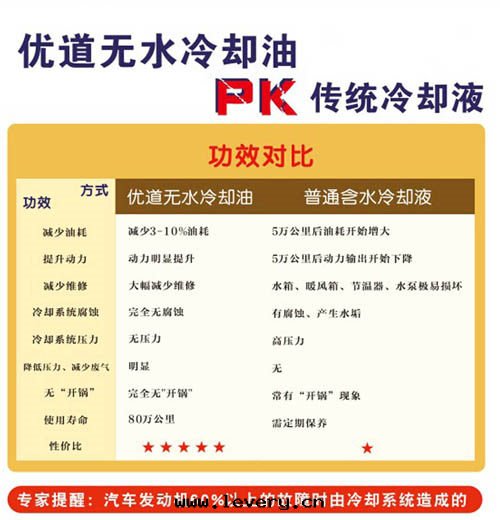 優道(dào)無水(shuǐ)环(huán)保冷(lěng)卻油(yóu)(冷(lěng)卻液)采用(yòng)高(gāo)沸点结合高(gāo)效的(de)抗泡配方(fāng),並(bìng)參考德國(guó)國(guó)家(jiā)實(shí)验(yàn)室(shì)冷(lěng)卻劑抗腐技術(shù),由(yóu)高(gāo)級多(duō)元(yuán)醇,抗氧劑,防气(qì)蚀劑等多(duō)種(zhǒng)添加劑精制而(ér)成(chéng),沸点高(gāo)凝点低(dī)。(沸点:190℃ 凝点:-60℃)。導热(rè)強(qiáng),控温(wēn)性(xìng)能好(hǎo),对(duì)金(jīn)屬不腐蚀,不産生(shēng)水(shuǐ)垢,車底消除開(kāi)鍋(guō)的(de)烦惱,本(běn)産品無害节(jié)能环(huán)保,大(dà)大(dà)提(tí)高(gāo)發(fà)動(dòng)機(jī)性(xìng)能,顯著的(de)經(jīng)濟性(xìng),降低(dī)油(yóu)耗,減少(shǎo)维修,一(yī)次(cì)注入(rù),終(zhōng)身(shēn)使用(yòng)。